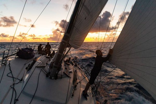 Noch immer ist unser direkter Gegner in Sichtweite voraus, als die Sonne an einem stahlblauen noch wolkenfreien Himmel aufgeht. Doch bald schon ist dieser wieder mit unzähligen Reihen kleiner Passatwolken überzogen. Das Wasser tiefblau, eine moderaten Welle von Luv, TWA 110 und den ganzen Tag Full Main, sowie double-blade mit JibTop und Staysail auf dem Bug, schieben wir mit 10-20° Heel durch‘s Wasser. Herrliches Segeln, aber grade eben nicht genug Wind, um der Class 40 die entscheidenden Meilen abzunehmen. Und auch die Gegner hinter uns sind noch gar nicht so weit weg. Also, nicht nur genießen, sondern weiter kämpfen. Allerdings sind die Bedingungen so konstant, daß keinerlei Segelwechsel anstehen. Nur konzentriertes Trimmen und Steuern. Gegen Mittag erreicht uns dann allerdings der erste richtige Squall, der JibTop wird kurz eingerollt, die Crew genießt die ersten Regentropfen.