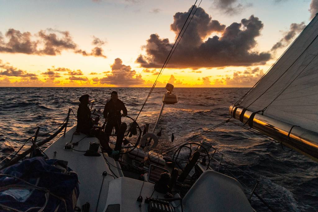Täglich grüßt das Gribfile. Neue Wetterdaten werden über unsere Ersatz-Satellitenverbindung Bit für Bit (kein Bier) an Bord gelockt und in der Navigationssauna zu einer Strategie verwurstet. Anfangs planten wir, unsere Gegner in einer Flaute parken zu lassen - leider nicht mit Erfolg. Also setzten wir vor zwei Tagen auf ein etwas südlicheres Routing, was sich bishher ausgezahlt hat. Wir schwimmen nun etwas weiter vorn im Strom und versuchen, keine Meile aufzugeben - bei teilweise unter 10kn Windspeed mit einer langen 3m-Dünung kein leichtes Unterfangen. Wir reden Groß und A2 gut zu nicht zu schlagen und nehmen bei jeder Bö Tiefe mit. Zwischenzeitlich werden auch Winddreher mit Halsen beantwortet und wir fühlen uns in beiden Hälften der Haspa Hamburg gleichermaßen heimisch (wobei Backbord mit mehr Erinnerungen verknüpft ist).