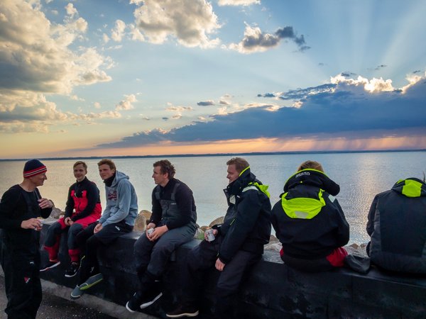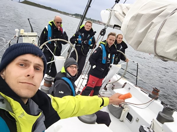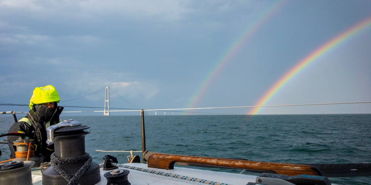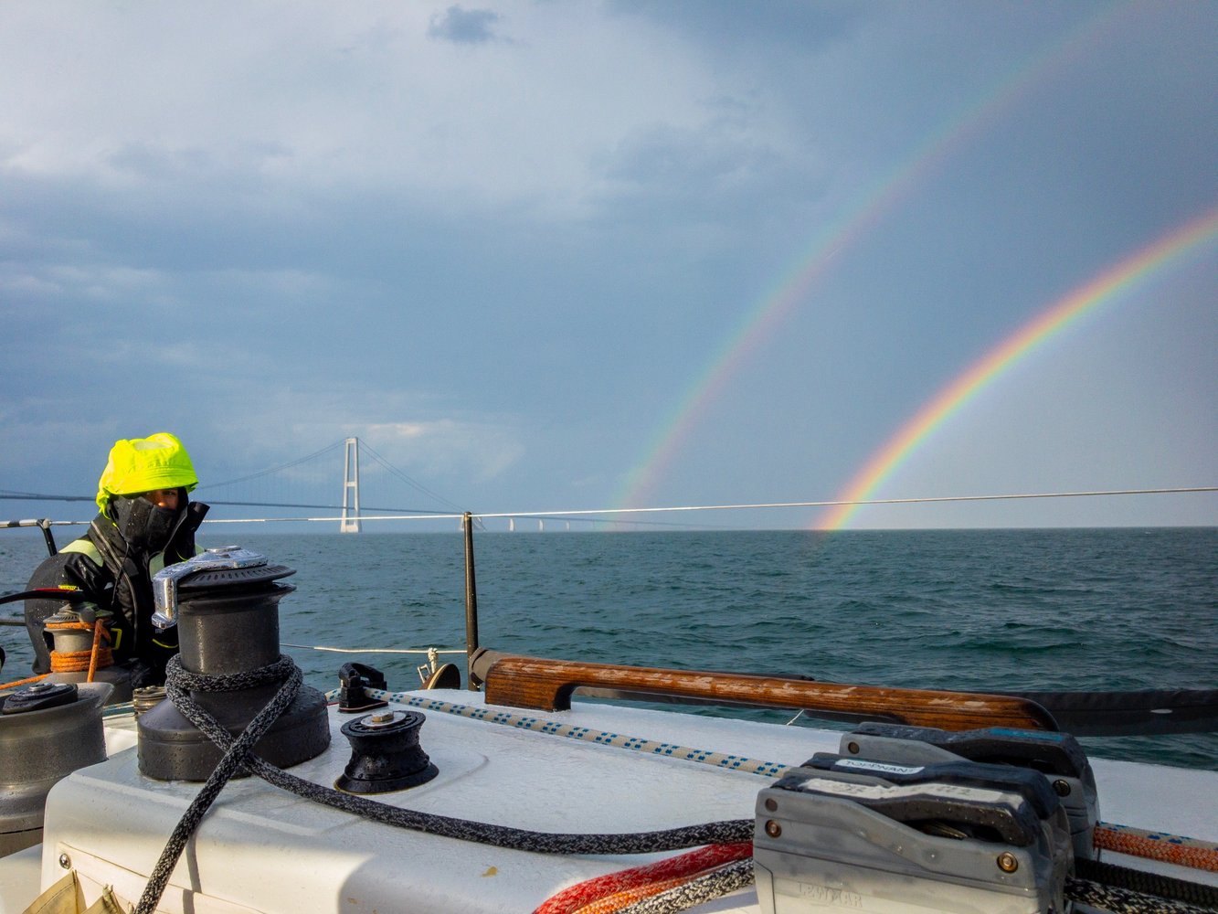 Der Freitagmorgen ist erneut von Missverständnissen bezüglich der Aufsteh- und Ablegezeit geprägt - was rückblickend zur Erheiterung der ganzen Crew beiträgt. Eventuell wäre eine Ablegezeit sinnvoller, als ein Aufstehwecker - die Schönheits- und Frischmachrituale sind schließlich bei jedem Crewmitglied individuell. Jedenfalls zeigt sich der Freitag mit weniger sonnigem Wetter, dafür jedoch mit (fast) konstantem Wind, sodass wir nahezu den ganzen Tag unseren am-Wind-Kurs mit der Großer-Belt-Brücke im Blick wunderbar fahren können. Mit den üblichen Worten „Oh, das wird eng!“ und „Sagmal, passt das eigentlich?“ geht’s drunter durch. Große Teile des Tages ist backbord hellblauer, sonniger Himmel, steuerbords liegen dunkle Wolken. Den ganzen Tag hoffen wir, dass der Wind nicht aussetzt und wir (für ein besseres Tour-feeling) auch vom Regen verschont bleiben. Ab 18 Uhr siegt die steuerbordseite, der Regen setzt ein; erneut bekommen wir Ausläufer eines Gewitters ab, wenn auch nicht so stark wie am Mittwoch. Der Wind frischt auf (yes!) und wir erreichen an der Kreuz unseren Tages-Topspeed von 12 kn. Wieder nahezu den ganzen Tag guter Wind, das Segeln ist erneut super und hat viel Spaß gebracht. Die paar Meilen unter Motor und der Regen zwischendurch tun dem kein Abbruch; wir sind sogar mit einem fantastischen Regenbogen belohnt worden.