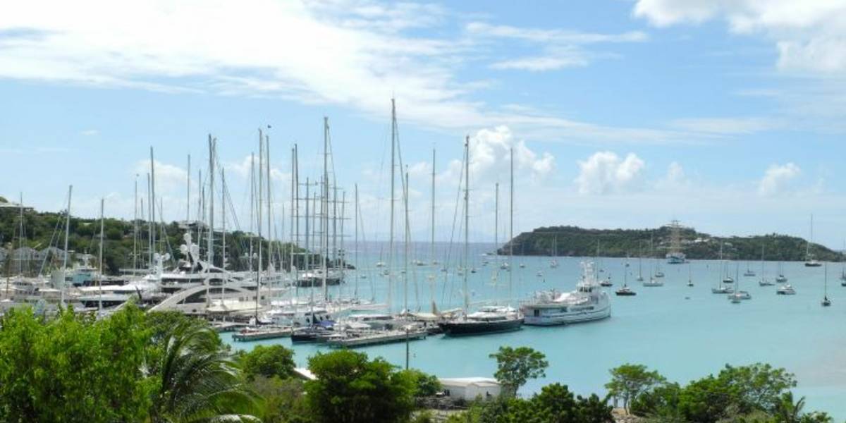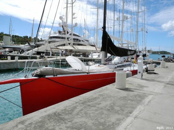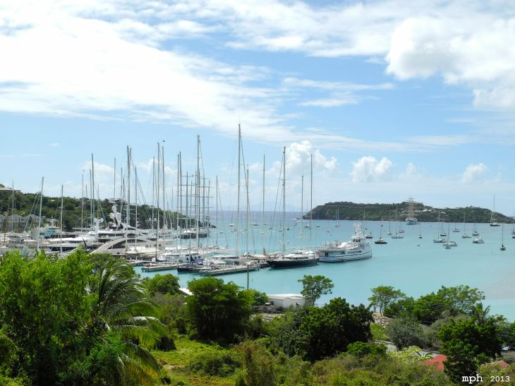 Bei Tagesanbruch liegt, früher als erwartet, Antigua voraus. Die „trockene“ Insel empfängt uns mit mehreren, teils heftigen Regenschauern. Nachdem alle naß sind, melden wir uns per Funk im nächsten Hafen , Falmouth Harbour an. Schon bei der Einfahrt stellen wir fest, dass wir hier eher zu den kleinen Schiffen gehören. Nach dem Festmachen an der Pier sind wir hier eines der wenigen Schiffe ohne Versorgungsdampfer und eigenen Hubschrauber. Dafür sicherlich eine der sportlichsten Yachten mit jugendlichem Charme.