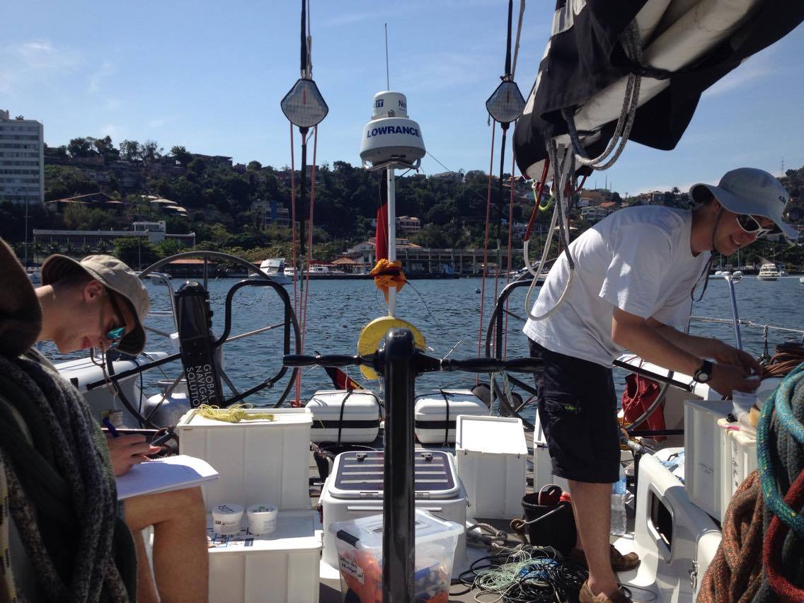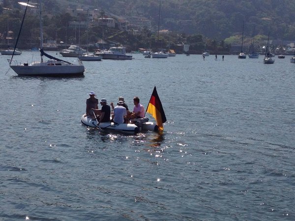 Nachdem gestern Abend die ersten neuen Crewmitglieder mit Jetlag eingetrudelt sind und sich eine Nacht erholt hatten, ging es heute Morgen mit einer Portion Müsli in den Tag. Das Boot musste einmal Inside-Out (übrigens ein klasse Film) umgekrempelt werden. Nach erfolgreicher Expedition in den Supermarkt mit äußerst freundlicher Hilfe der brasilianischen Zivilbevölkerung, welche uns in eine 10 minütige Erklärung über die Vorteile des zuckerfreien Jogurt auf portugiesisch involvierte (wecher nach unser Kapitulation auch gekauft wurde) ging es dann an eine gründliche Bestandsaufnahme. Von alten Socken, über Starbuckstassen bis zum coolen Autoquartett wurde alles gefunden. Vor lauter Begeisterung zeigte der Außenbordmotor dann auch gleich fehlercode e45 - Überhitzung. Glücklicherweise besteht unsere Crew ausschließlich aus starken Männern, die Wasserhol-, Dusch- und Caipirinhatouren problemlos mit den Rudern meisterten. Nun sitzen wir beim gemütlichen Bierchen im Iate Clubbe Brasileiro und das geordnete und glänzende Schiff wartet freudig auf unsere Rückkehr und intensive Kojenbegutachtung heute Nacht.