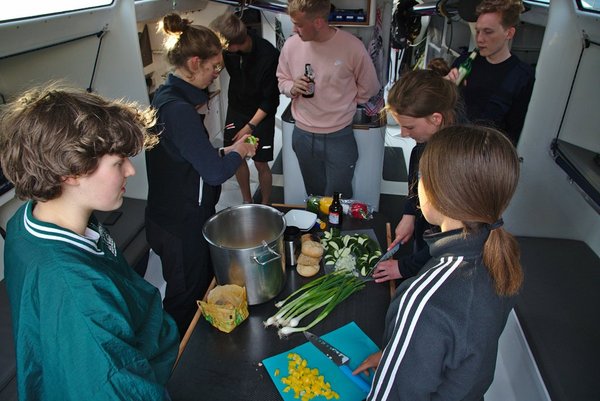 Diese Zeit nutzten wir sehr gut für eine großzügige Schiffseinweisung und eine Runde Frühsport - außer für Claire, die wir den Mast hochzogen.