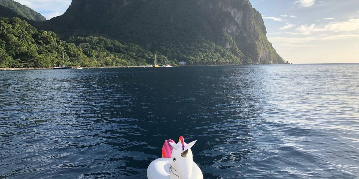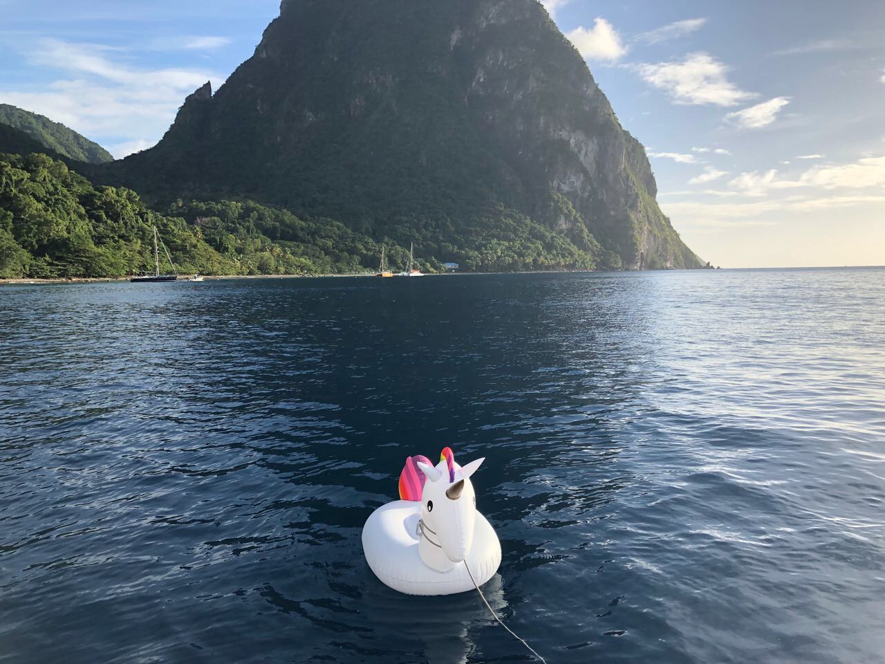 Der Samstag war geprägt von Schiffsübergabe und Großeinkauf für die nächsten Tage. Am Sonntag ging es erstmal raus, um sich mit dem Schiff wieder vertraut zu machen, dann entspannt vor St. Anne vor Anker zu gehen und den Abend ausklingen zu lassen. Am Montag Morgen wurden die letzten Dinge in Le Marin geregelt und es ging auf nach Saint Lucia. Nach einer traumhaften Überfahrt mit 15 - 20 Knoten Wind und kurzzeitiger Delfinbegleitung haben wir in der Soufriere Bay, direkt unterhalb des Petit Piton, ein schönes Plätzchen gefunden. Nach einem traumhaften Sonnenuntergang schwammen im dunklen Wasser Leuchtquallen um das Boot. Der folgende Tag war geprägt durch einen Landausflug mit Besichtigung eines Wasserfalls und einer Bananenplantage sowie durch Sonnenbaden und Schnorcheln.