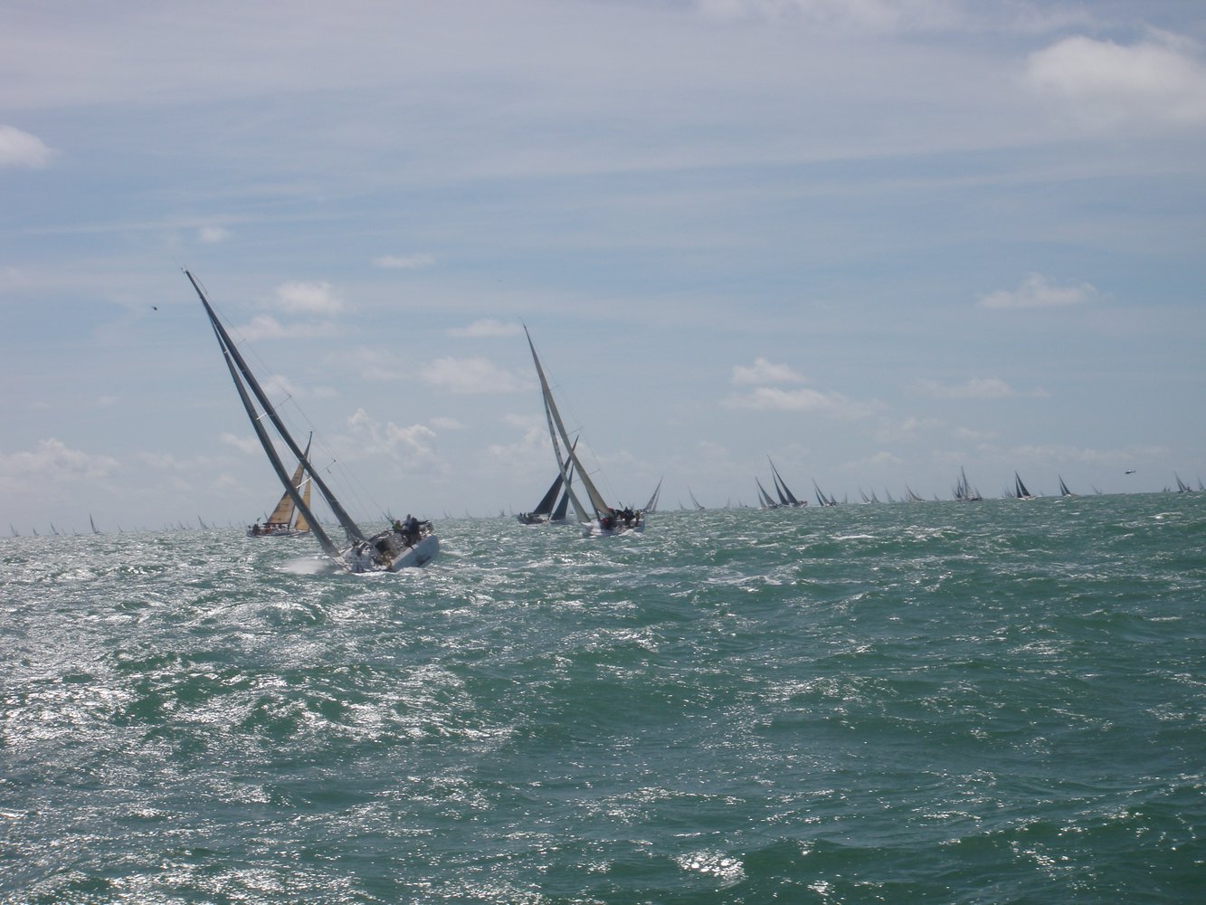 Und jetzt wird es ernst. Wir sind uns schnell einig, dass die Südseite der Startlinie im Vorteil ist. Das haben sicher aber auch die anderen erkannt. Insofern bleibt die Frage, wie wir das umsetzen. Aber das Vertrauen in unseren Taktiker wird belohnt und gefühlt überqueren wir mit dem Pulverdampf aus der polierten Kanone vor Cowes die Startlinie. Alle sitzen auf der Kante. Speed und Höhe stimmen, so dass wir uns im Feld mit freiem Wind gut behaupten.