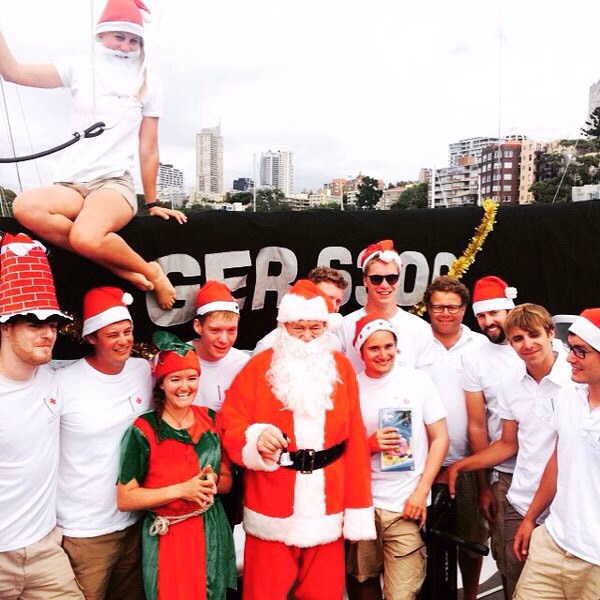 Wir sehen nochmal darüber hinweg, dass der Weihnachtsmann, im Gegensatz zum Christkind, eine US-amerikanische Erfindung ist. Als er samt Rentier auf einem Tender zur weihnachtlich geschmückten Haspa kam und auch noch Geschenke überreicht, freute sich die ganze Crew. Gregor war der erste, der Gesicht und Stimme der Seglerlegende Sir Robin Knox-Johnston zuordnen konnte. Seine Antwort: "Well, I'm Santa"...