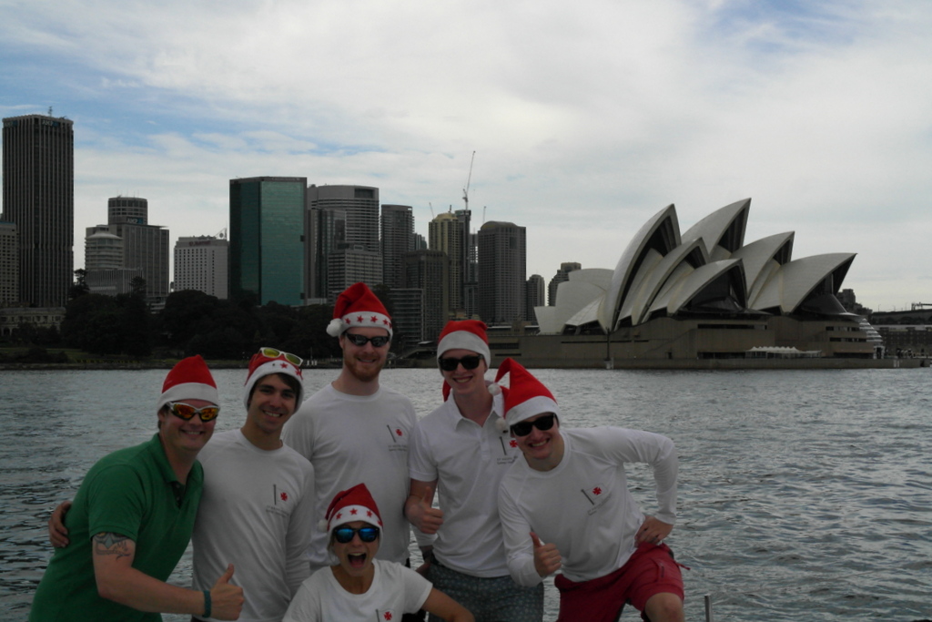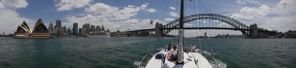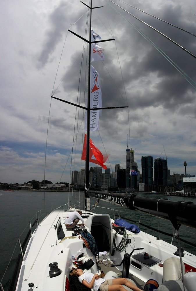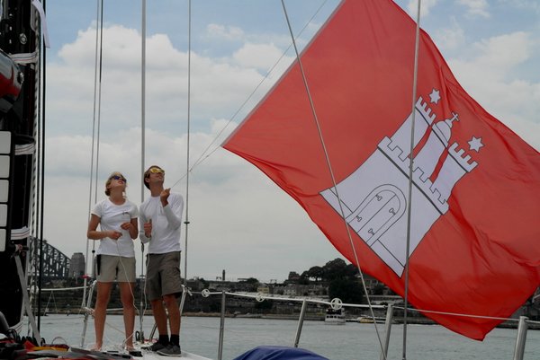 Unglaublich fix wurde der Mast gestellt und die neuen Fallen eingezogen, die netten Australier tauschten sogar das benötigte Datenkabel gegen ein Crewshirt ein - und schon zeigte unser Display wieder die Spannungen an. Der Rückweg wurde mit Freude, Musik und Flaggenparade angegangen, unter der Sydney Harbour Bridge und an der Oper vorbei - spätestens jetzt war allen klar, dass wir hier wirklich ein Segelprojekt vor uns haben. Für noch mehr Flaggen brauchen wir aber ein neues Rigg mit längerem Vorstag, was wir für neue Sponsoren natürlich in Kauf nehmen würden.