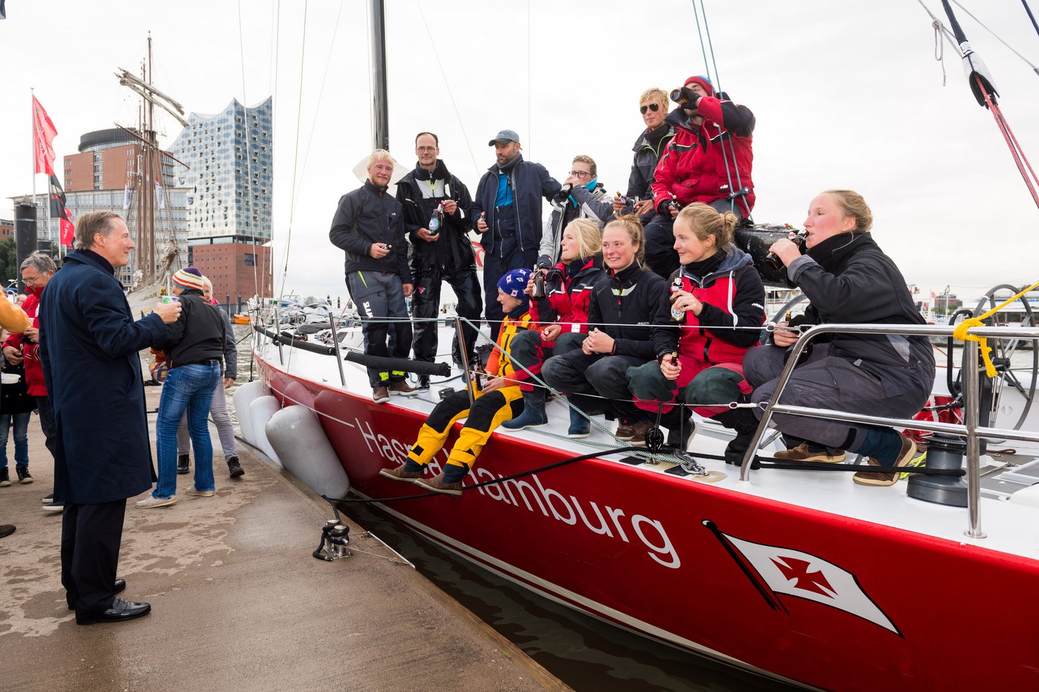 Am Steg dann der große Empfang durch Eltern, Freunde, Freundinnen, Kinder, Segelgruppen- und HVS-Mitglieder und auch Herr Dr. Vogelsang hatte es sich nicht nehmen lassen, die „Haspa Hamburg“ wieder daheim zu begrüßen. Dank besonders an Burkhard Rosenberg für die Suppe und diversen Müttern für GT und Kuchen - das war großartig!