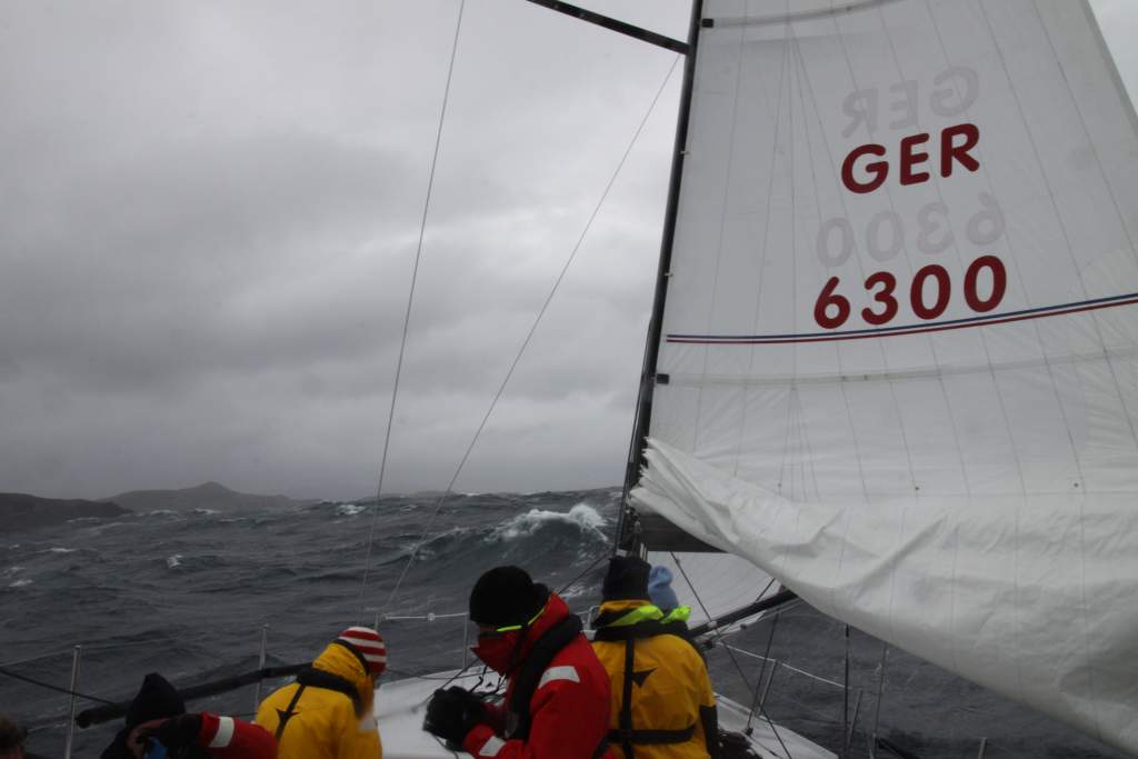 Windbedingungen machten es uns nicht leicht, die beiden Engstellen der Magellanstraße (Segunda Angostura und Primera Angostura) in einem Rutsch zu passieren. Doch Dank der Dieselfock am Ende kein Problem. Auf den ersten Meilen wurde auch der Wachplan festgelegt, welcher nun das Bordleben bestimmt. Von uns sieben rotieren sechs in einem dreistündigen Rhythmus von Wache, Freiwache und Stand-By. Dabei sind immer zwei gleichzeitig an Deck. Wachpärchen gibt es keine, denn die Wachzeiten beginnen 1,5 Stunden versetzt. Dadurch bleibt das Know How an Deck und die Übergaben laufen ohne große Bewegungen unter und auf Deck ab. Chriggel als Skipper, Navigator und Mädchen für alles ist wachfrei und hat seinen ganz eigenen Rhythmus. Bei herrrlichem Spätersommerwetter (Herbstanfang) servierte Vincent uns pünktlich zum Sonnenuntergang das Abendessen, während unser achtes Crewmitglied, der Autopilot uns sicher durch die Welle steuerte. Alle waren sich einig, das Chickencurry mit Reis, Ananas, Paprika und caramellisierten Mandeln und Cashewnüssen war spitze. Gegen Mitternacht dann endlich die offene See. Kurs Nordost und 7 Windstärken von hinten bescheren uns eine schnelle Reise. Gute 200 Meilen in den ersten 24 Stunden. Montagvormittag bekam die argentinische Bürokratie ihre letzte Chance