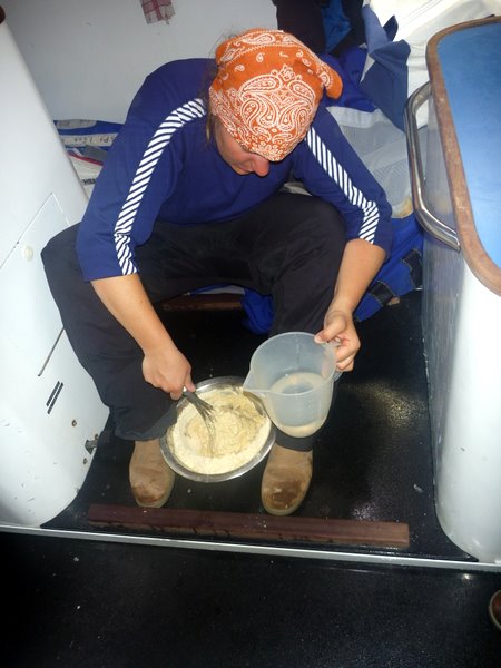Noch sind wir mit gut 9,5 Kn unterwegs. Der neue Wetterbericht hat uns das Ausmaß der Flautenkatastrophe sehr deutlich vor Augen geführt und nun hoffen wir, dass unsere Taktik aufgeht und wir nicht zu lange in der Flaute liegen. Eine Bestätigung für unsere gestrige Entscheidung brachten uns die Positionsmeldungen einiger Gegner, die ihr Bestreben in den Norden zu segeln, sichtbar werden ließen. Jetzt heißt es also, aufgrund der niedrigen Temperaturen angezogen wie Michelinmänchen, Gas zu geben und zu hoffen, dass es unseren Gegner nicht gelungen ist ausreichend weit in den Norden zu gelangen. Wir werden sehen - abgerechnet wird im Ziel! Dass die Bewegungen auf diesem Kurs aufgrund der Schräglage deutlich beschwerlicher sind und alltägliche Arbeiten wie das Kochen auf den Fußboden verlegt werden müssen, nehmen wir dafür gerne in Kauf.