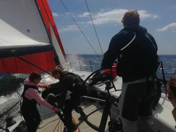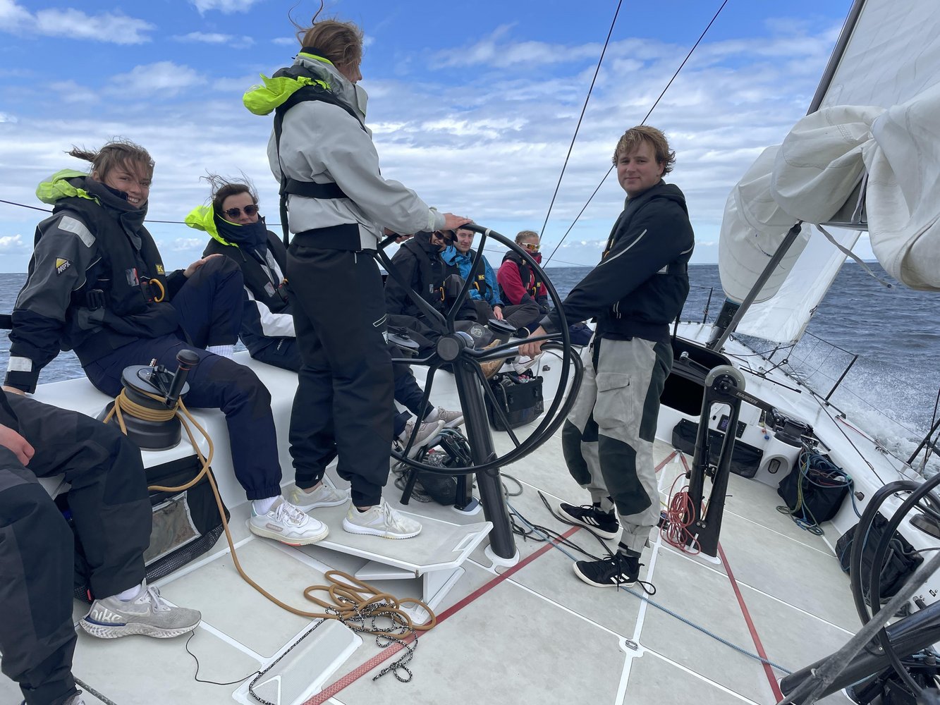 Am nächsten Tag ging es dann mit dem geplanten, schönen Gennaker Kurs zurück Richtung Kiel. Das Gennaker fahren auf unserem neues Racer hat allen eine Riesenfreude gemacht und es wurde sich regelrecht ums Steuern und Trimmen gestritten. Zusätzlich zu dem guten Wind hatten wir auch richtig Sonne. Wir waren superschnell unterwegs und haben Geschwindigkeiten von 18 kn erreicht. Hierdurch waren wir schon zum Mittag wieder in zurück Düsternbrook.