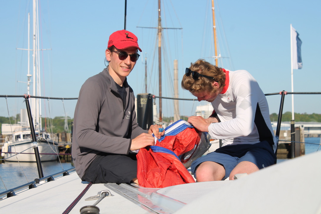 Hinter Friedrichsort beginnen wir mit dem Race-Mode. Die Positionen sind verteilt, die Abläufe abgesprochen. Jetzt gilt es das Zusammenspiel zu optimieren. Klar zur Wende - re, Kite hoch, Genoa runter, klar zu Halse – rund achtern, Kite runter, mal in Lee, mal in Luv mit dem Kiwi-Drop, einfach an der wieder gesetzten Genoa ins Vorluk gezogen.