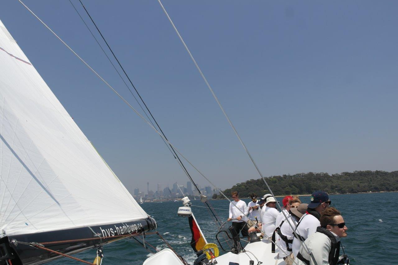 Während man von Hamburg aus Tage unterwegs ist, um eine echte Offshoredünung erleben zu können, braucht man in Sydney eine knappe Stunde an der Kreuz. Kaum fährt man an den Sydney Heads vorbei, die die Einfahrt in den Port Jackson (aka Sydney Harbour) flankieren, fährt der Fahrstuhl hoch und runter. Bei zwei Crewmitgliedern fiel die Eingewöhnungsphase etwas heftiger aus, wurde aber als normale Körperreaktion von allen mit Humor genommen.
