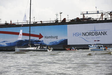 Licht und Schatten lagen für die 24 Yachten des HSH Nordbank blue race an diesem Wochenende ganz nah beieinander. Die Crew der „Outsider“ wurde unter großem Jubel als erstes Schiff der Flotte in Cuxhaven begrüßt. „Welcome home“ stand auf den T-Shirts des großen Empfangskommitees, der Rettungskreuzer „Hermann Helms“ schickte Wasserfontänen in den grauen Himmel und sogar ein kleines Feuerwerk wurde entzündet, als die silbergraue Yacht um 16.14 Uhr die Ziellinie vor Steubenhöft querte. Gut 100 Freunde und Verwandte waren gekommen, um die Atlantik-Segler nach den Strapazen zu begrüßen. 14 Tage, 20 Stunden und 14 Minuten und 10 Sekunden war die deutsch-neuseeländische Crew unterwegs.