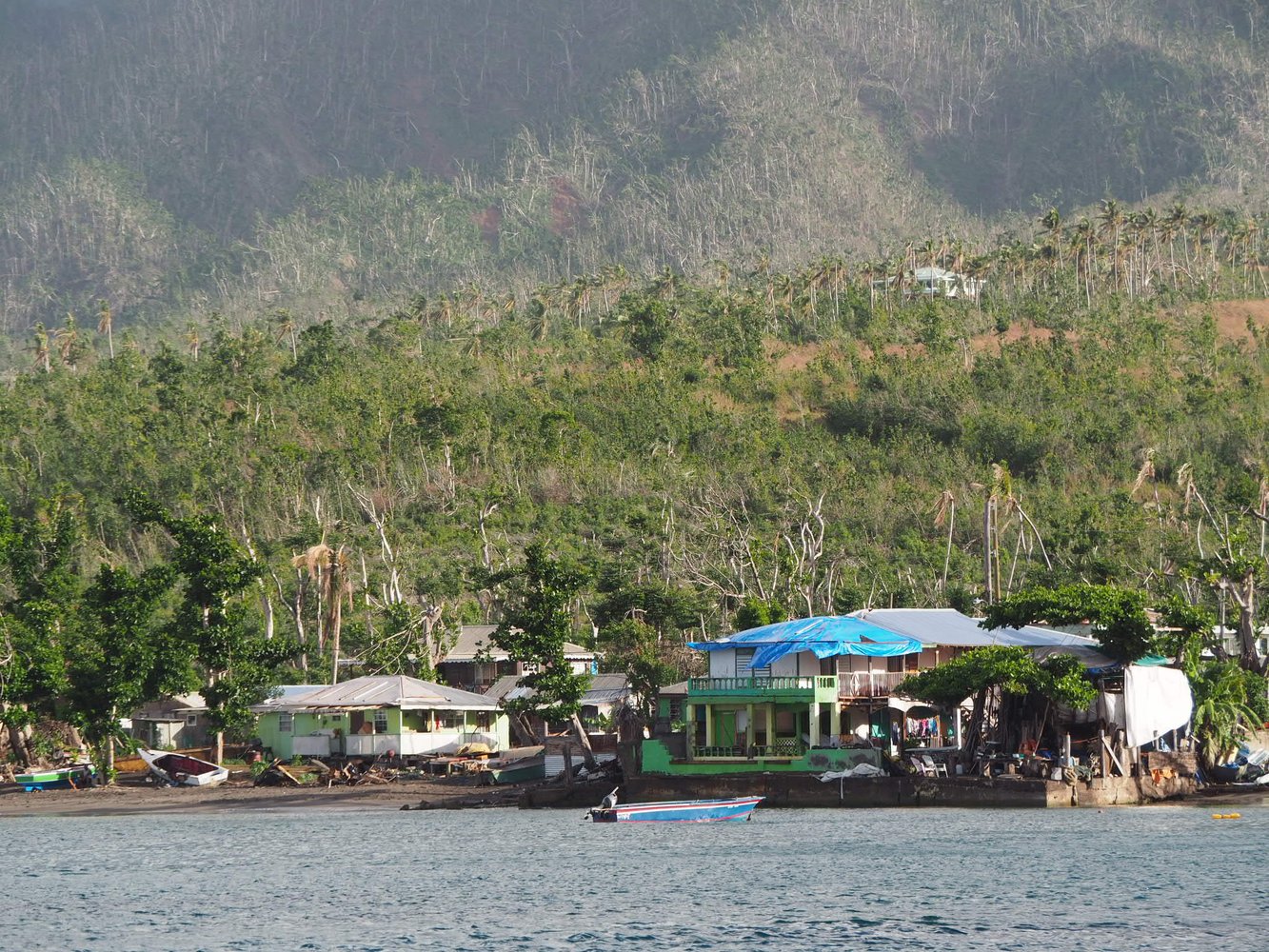Wir erreichen die Bucht von Phillipsburg im Norden von Dominika im Dunkeln und nach zahlreichen heftigen Schauern mit heftigen Böen. Dankenswerterweise regnet es beim Ankermanöver gerade nicht. Der Morgen bricht an und verschlafene Crewmitglieder versammeln sich an Deck. Der Anblick stimmt nachdenklich: Dominica ist intensiv von den Hurricanes heim gesucht worden. Wir sehen die fröhlich bunten Hütten und Bars an Land, teilweise ohne Dach mit eingestürzten Vordächern. Bäume liegen kreuz und quer, dazwischen Boote, die es einfach an Land geblasen hat. Ein großes Hotel steht komplett ohne Dach da - Totalverlust. Dann fängt es auch schon wieder an zu regnen. Bei aller Neugierde, die Schönheit Dominicas wollen wir uns für den Rückweg aufheben, vielleicht ist dann auch besseres Wetter. Schon rauscht der erste Einwohner mit seinem Holzboot längsseits und bietet uns seine Dienste an. Er heißt Daniel und berichtet in erstaunlicher Gelassenheit von den Verwüstungen des Hurricanes Maria - Respekt. Wir bitten Daniel, einige Besorgungen für uns zu machen, bevor wir uns weiter in Richtung der Isles des Saints machen. Denn alleine durch aufmunternde Worte werden sie die Hütten nicht wieder aufbauen können.