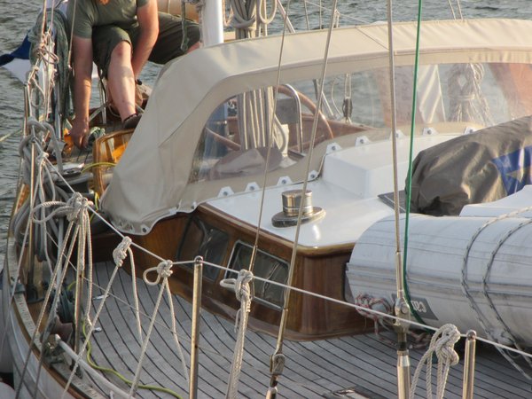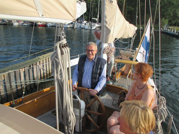 Das Boot war 1967 für den 100. Geburtstag des NRV gebaut worden und wurde dann bis 1974 von der Segelgruppe Störtebeker gesegelt. Klaus Stick, Crewmitglied in 1968, hatte heute Gelegenheit, das Boot zu besuchen, auch Fritz Lorenz, der in den 70ern Skipper war, tauschte sich mit Klaus und den Eignern aus, was noch im Originalzustand war und was wohl neu eingebaut worden ist. Die Augen glänzten. Viele junge Segelgruppenmitglieder kennen den Bezug zu "ihrem" Boot, sei dies nun die "Störetebeker", die "Hamburg X" oder eines der vielen anderen Boote, die der HVS bis heute den jungen Leuten zur Verfügung stellt. Auf der Seebrücke des LYC sprachen darüber auch die ehemaligen Skipper Reinhard Wiegers und Henning Rocholl. Am nächsten Freitag treffen sich dann junge & jung gebliebene im Sandtorhafen, um die zurückliegenden Jahrzehnte des Segelns auf Booten des HVS zu beleuchten. Dabei werden die Crewmitglieder der Transatlantikregatta