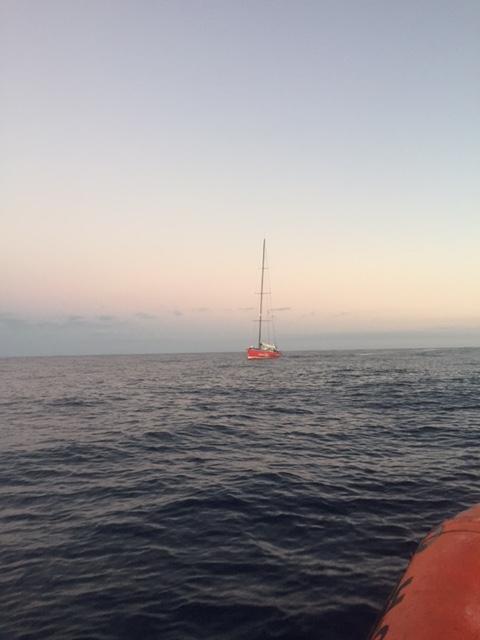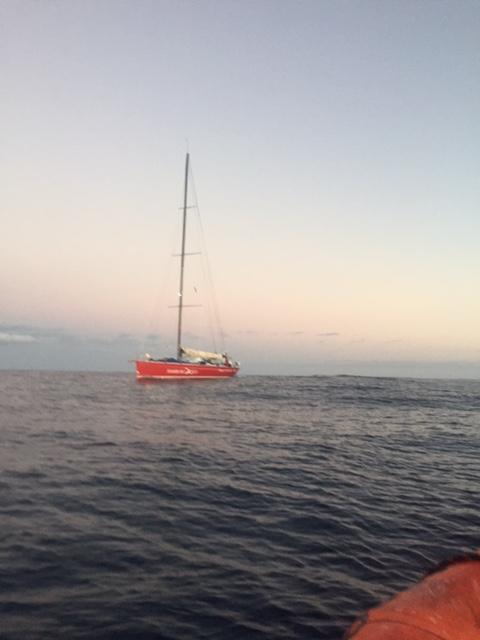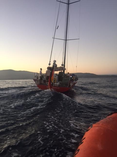 Unter Begleitung der "Bank von Bremen" und einem Schlauchboot, die der Crew etwa 3sm entgegen gefahren waren, lief die Haspa mit ihrer sechsköpfigen Crew heute Abend um 20:00 Ortszeit in Horta ein. Begrüßt wurde Georg und seine Crew von der wartenden Nachfolgecrew mit kühlem Bier und großen Pizzen direkt an der Pier.