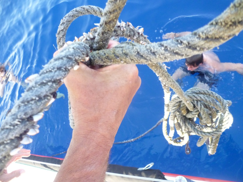 Allerdings haben wir in der Flautenzeit nicht nur Bravo gelesen, sondern auch viel erledigen können und eine erschreckende Entdeckung gemacht. Neben einem Mastcheck und weiteren kleinen Reperaturen, die man in der Flaute angenehm machen konnte, mussten wir feststellen, dass wir im Laufe der letzten Tage eine dicke Fischerleine um unseren Kiel gewickelt haben. Keiner weiß, wie lange wir sie geschleppt haben, aber nach Katrinas heldenhafter Entdeckung konnten wir sie schnell entfernen, sodass wir endlich wieder den gewohnten Speed fahren können.