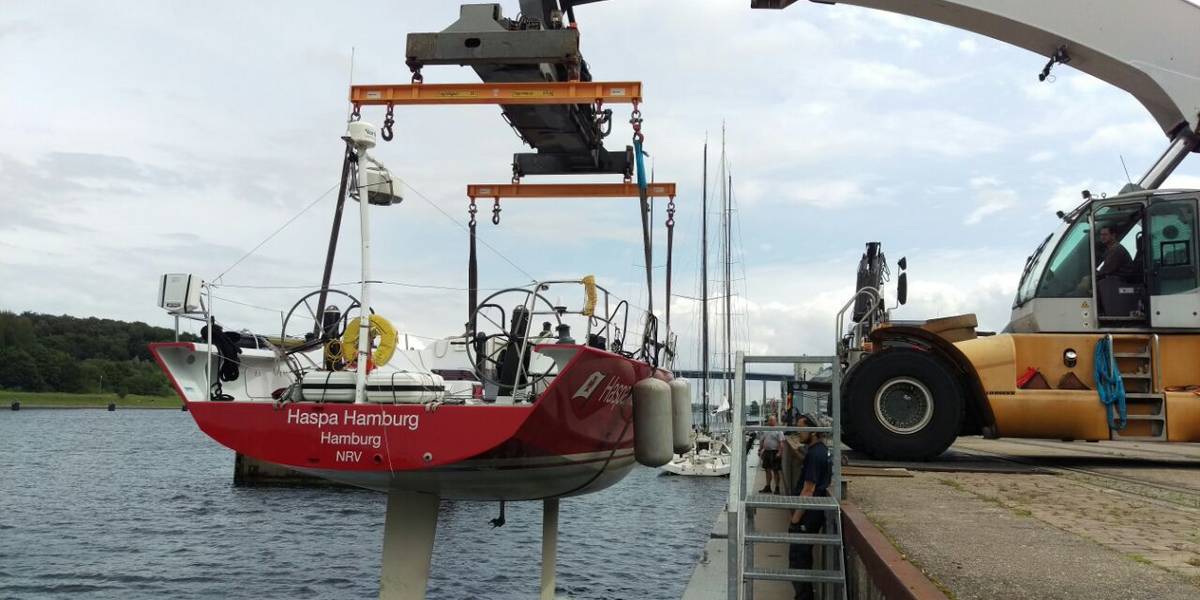 Der Mast wird heute Nachmittag gestellt. Das Schiff kann nun für das anstehende Rolex Fastnet Race eingräumt werden. Es juckt uns schon unter den Fingernägeln, die Haspa ab Sonnabend in den Solent zu segeln und freuen uns riesig auf die anstehende Regatta.