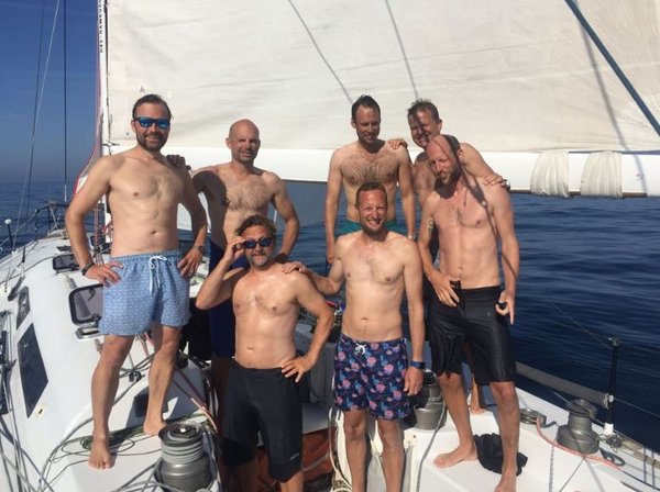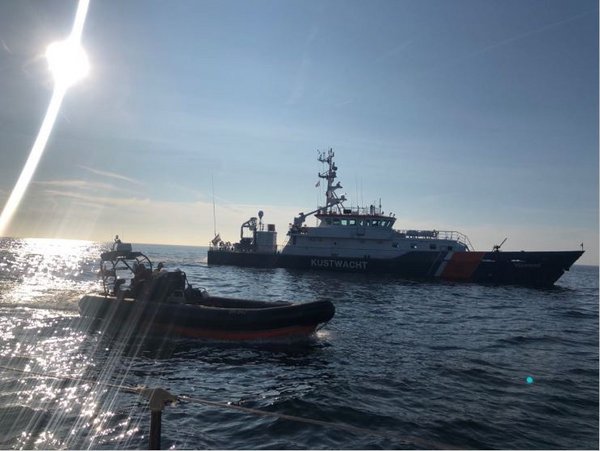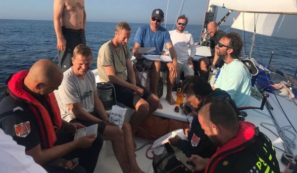Die spätnachmittägliche Teestunde erfuhr eine weitere spannende Abwechslung: Vin Diesel, der jetzt bei der Holländischen Coast Guard arbeitet, sauste mit vier Kollegen im 370 PS Rib heran. Dass er das draufhat, hatte er ja schon in The Fast & The Furious eindrucksvoll auf vier Rädern untermauert. Gut gelaunt luden wir die neuen Freunde zu uns an Bord ein, und reichten Vin und seinen Kumpels unsere dicken Pranken zur Begrüßung. Kaffee und Schokolade lehnten sie ab, da sie im Dienst waren, aber waren ansonsten sehr aufgeschlossen. Insgesamt gut 30 Minuten plauderten wir angeregt über die Regatta und den Atlantik, sie fragten uns interessiert nach allen Details, ob wir unterwegs Auffälligkeiten oder sicherheitsrelevante maritime Ereignisse bemerkt hätten, und dann zeigten wir ihnen unter tosendem Gelächter aller lustige vorher-nachher-Bilder anhand unserer Passfotos im Reisepass. Trotz gewachsener Bärte erkannten sie fast jeden von uns sofort. Wir demonstrierten ihnen den YB Racetracker und verwiesen auf die Wettbewerber, von denen sie aber noch niemanden bemerkt hatten. Wir zeigten ihnen, wem wie uns eine kurze Rennunterbrechung gut tun würde und deren ungefähre Position. Ein lustiges Verwirrspiel erzeugten der alte und neue Schiffsname in den Bordunterlagen, was wir als Ratespaß zum Knobeln aufgaben. Unter großem Gejohle lösten wir das Rätsel aber schließlich schulterklopfend auf. Auch unter Deck durften die Freunde im wahrsten Sinne des Wortes einmal in den Offshore-Regatta-Alltag hineinschnuppern und ließen sich alles ausgiebig zeigen. Ob wir denn noch nicht einmal eine Bratpfanne hätten, wollten sie zum Beispiel wissen. Lachend verneinten wir dann die Fragen nach Alkohol, Waffen oder Drogen, wir hätten ja selbst keine Zigaretten mehr. Ob sie uns diesbezüglich irgendwelche "Seized Goods" zum Kauf überlassen könnten, fragten wir, aber darauf gingen die rührigen Beamten nicht weiter ein. Nach einer halben Stunde und ein paar Selfies mit uns mussten die Jungs los, und so ließen sie uns und die Fußspuren ihrer schwarzen Sicherheitssohlen auf dem frisch geschrubbten Deck zurück. Winkend rasten sie zu ihrem 43 Meter Mutterschiff, auf dem Vins Leibwächter und andere Entourage warteten.