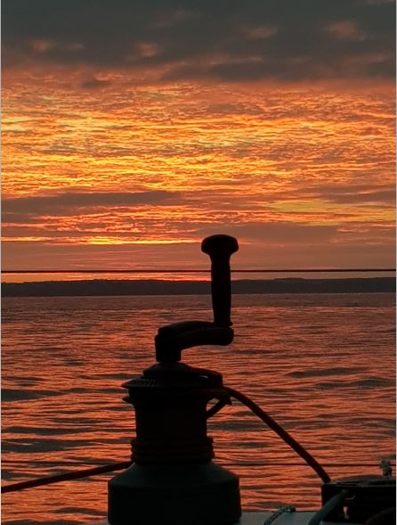 Nun in der Nordsee und nach einem mangels Honig, aber dennoch unnötigen Sardellenbrot lassen wir England bald hinter uns, und so werden die Winchen wieder auf rechtsdrehend gestellt. Mit einer weiteren neuen Wasserfarbe im Kielwasser und einem doch recht passablen Sonnenuntergang treten wir nun eine unserer letzten Nächte des AAR an. Wir freuen uns auf Zuhause!