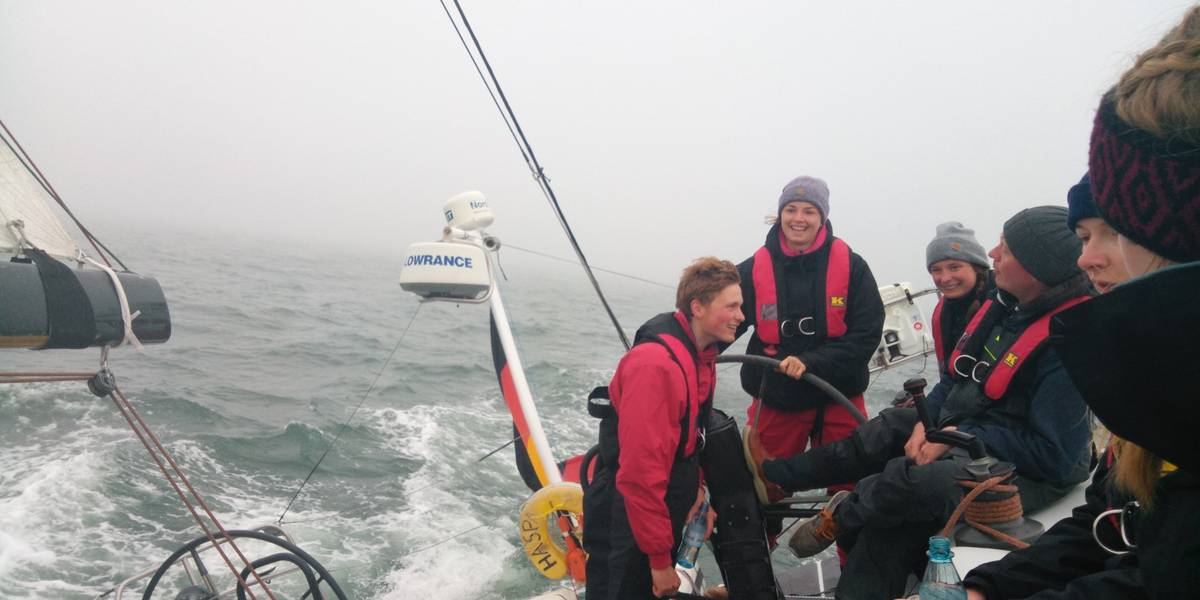 Am vergangenen Wochenende durfte die neue Generation an hoffentlich baldigen HVS Mitgliedern selbst das Steuer in die Hand nehmen. Auf der Jungfernfahrt von Katrina Westphal als Skipperin konnten die Jollenumsteiger und Neusegelbegeisterten von eingefleischten HVS Mitgliedern wie Katrina, Jan, Marvin und Rickmer viel im Umgang mit einem Dickschiff wie der Haspa Hamburg lernen. Von Glücksstadt ging es über Cuxhaven nach Helgoland. Nach den Sicherheitseinweisungen kam man bereits ins Gespräch. Auf solch einem Törn treffen Jollensegler auf erfahrene Transatlanten sowie „Alsterschipperer“. Jeder konnte etwas von dem Anderen lernen und am Ende hatte man seine Aufgabe in der Crew gefunden. Untypisch für die Nordsee und nicht ganz wie der Wetterbericht angekündigt hatte, trafen wir auf strahlenden Sonnenschein und eine leichte Brise. Auf Helgoland angekommen musste natürlich erst einmal ein „Anlegebierchen“ getrunken werden, damit „die Neuen" auch schon einmal die richtigen Normen und Traditionen kennenlernen, die so herrschen. Die frisch auf der Insel gekauften Rollmöpse wurden dann erst einmal bei dem Spaziergang mit über die ganze Insel geschleppt, bevor sie zum selbstgekochten Labskaus serviert wurden. Segel hochziehen ist schließlich nicht Sport genug. Abgerundet wurde der Abend traditionell mit einem Eier-Grog in der „bunten Kuh“ und Gesprächen bis spät in die Nacht. Alle 12 konnten selbst erleben, wie viel Spaß es macht, mit einer Crew verschiedensten Alters zu segeln. Jeder erzählt einen anderen „Schwank aus dem Leben”. Am Sonntag mussten wir jedoch zum Erschrecken feststellen, dass man beim Zähneputzen an Deck kaum die Zahnbürste in der Hand gesehen hat, da es so nebelig war. Im Laufe des Tages konnte man die Frachter jedoch wieder bei blauem Himmel am Horizont erkennen und musste sich nicht mehr erschrecken, wenn auf einmal ein Containerschiff wie bei „Fluch der Karibik“ aus dem Nebel fuhr. Alles Erfahrungen und Erlebnisse, die den Jungs und Mädels das Offshore Segeln immer näher bringen. Am Ende des Wochenendes fuhr jeder mit einem Lächeln und einem leichten Sonnenbrand wieder nach Hause. Ein Wochenende voller neuer Eindrücke, die Euch hoffentlich dazu leiten, wieder mit zu segeln um Land und Leute kennen zu lernen und die Freude am Segeln bei zu behalten.