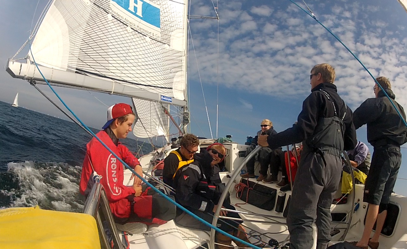 Nach einem zweiten, besseren Start und leider einem großen "Fu*** up" an der Tonne haben wir uns langsam ans Hinterhersegeln gewöhnt... aber die Stimmung sollte nicht darunter leiden.