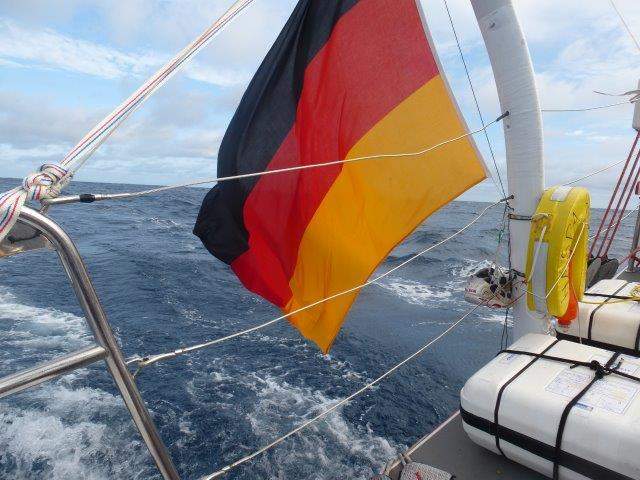 Nichtdestotrotz ist die Stimmung weiter positiv und die ersten Vorboten der Besserung sind bereits gesichtet worden: Vor wenigen Minuten haben wir die ersten Albatrosse, die Schutzheiligen der Seefahrer, gesichtet. Um noch einmal auf Nummer sicher zu gehen, haben wir außerdem die Schuhe eines Crewmitglieds, deren Verbleib unter Deck nicht mehr zumutbar war, am Radarmast aufgehängt. Um böse Geister fern zu halten. Es kann also nichts passieren.