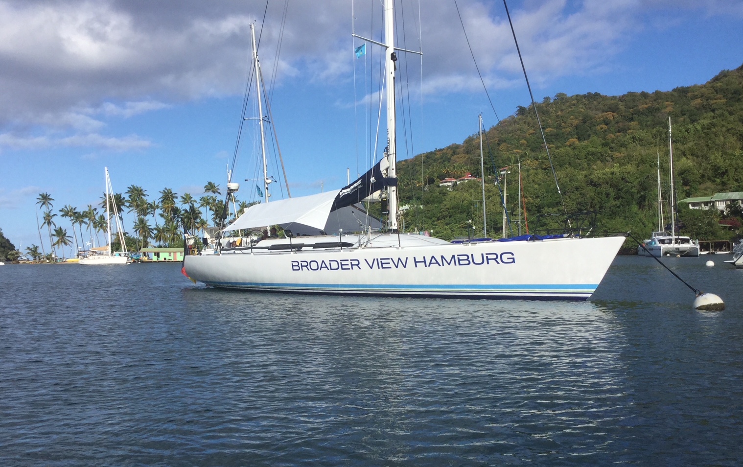 Die ersten beiden Crewmembers waren bereits am Freitag an Bord, um die BroVi von Dirk zu übernehmen. Sie begannen auch gleich mit der Verproviantierung und ein paar erfolgreichen Wartungsarbeiten. Es ist eben immer etwas zu tun. Am Sonnabend abend traf der Rest ein und wurde an Bord begrüßt mit einem kalten Bier. Die ersten beiden Tage verbringen wir in Le Marin, es weht gewaltig und es gibt viele heftige Schauer. Hier treffen wir uns auch mit Freunden, die seit 3 Jahren mit ihrem eigenen Schiff unterwegs sind und für die wir natürlich einiges im Koffer haben. Nach