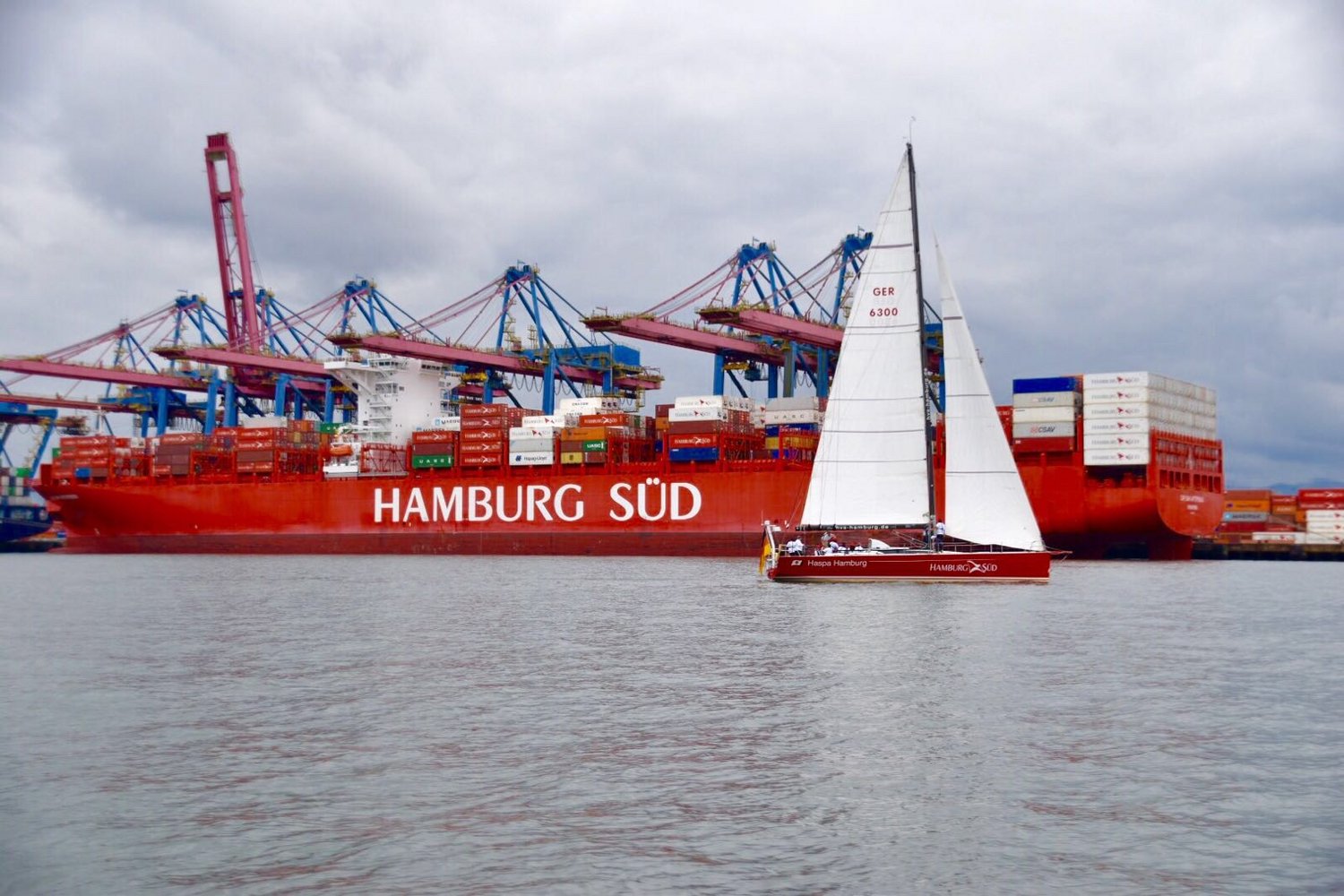 Wir verlassen Itajaí bei Sonnenschein und Schäfchenwolken. 36 Stunden und 230 Seemeilen liegen vor uns. Die erste Wache geht schlafen, die zweite genießt den Sonnenuntergang. Dresscode ist lange Unterwäsche, Salopette und Ölzeug, aber mit jeder Meile merken wir, dass es wärmer wird. Das Essen ist lecker, die Stimmung ist gut, nur der Wind lässt auf sich warten und die Eisenfock schiebt Überstunden. Tagsüber spielen zwei Delfinschulen mit dem roten Bug der Haspa Hamburg\n eine willkommene Ablenkung vom monotonen Gerödel des Motors. Apropos Ablenkung: Schneller als gedacht wird die Men's Health und die Bunte zur allgemeinen Lektüre sowohl der aktiven als auch freihabenden Wache. Trotz alledem liebt die Haspa Hamburg es endlich wieder durch die Wellen zu schießen. Als Highlight ging es dann bei stockfinsterer Nacht in die hell erleuchtete Hafenstadt von Sao Paulo: Santos. Wir verbringen zwei Nächte im Wachsystem an einer Spundwand des Marinegeländes mitten im Container Terminal. Bunte Lichter überall und als wäre es wie für uns bestellt: ein Hamburg Süd Frachter direkt gegenüber von uns.