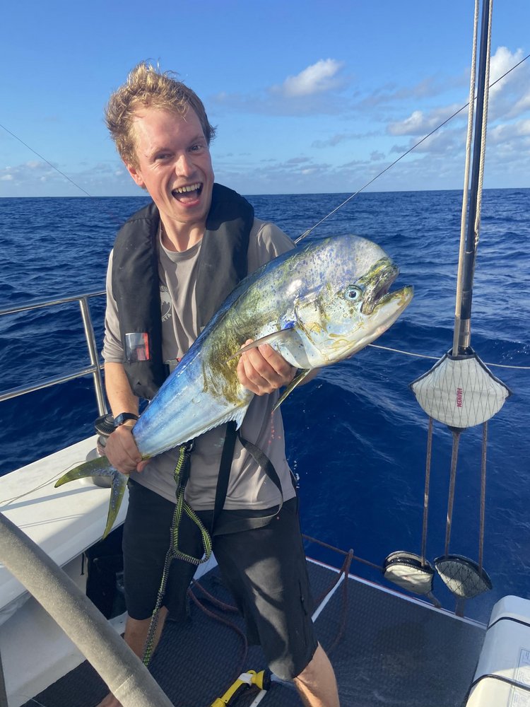 Der Mittwoch konnte dennoch mit einigen Highlights aufwarten. Gleich zu Beginn wären da die Frühstücks-Pfannkuchen zu erwähnen, die auch dem größten Morgenmuffel das Aufstehen erleichterten. In dem Glauben, dass dieses Frühstück bei strahlendem Sonnenschein nicht weiter getoppt werden könne, ratterte auf einmal die Spule von Bernhards Angel los und nach minutenlangem Kampf hatten wir einen wunderschönen, ca. 10 kg schweren Mahi Mahi (Goldmakrele) an Deck. So war schon beim Frühstück auch das Abendessen gesichert. In der Folge wurde der Freund fachmännisch filetiert und bereits probiert. Fazit: Eindeutig Sushi-Qualität und sehr sehr lecker!