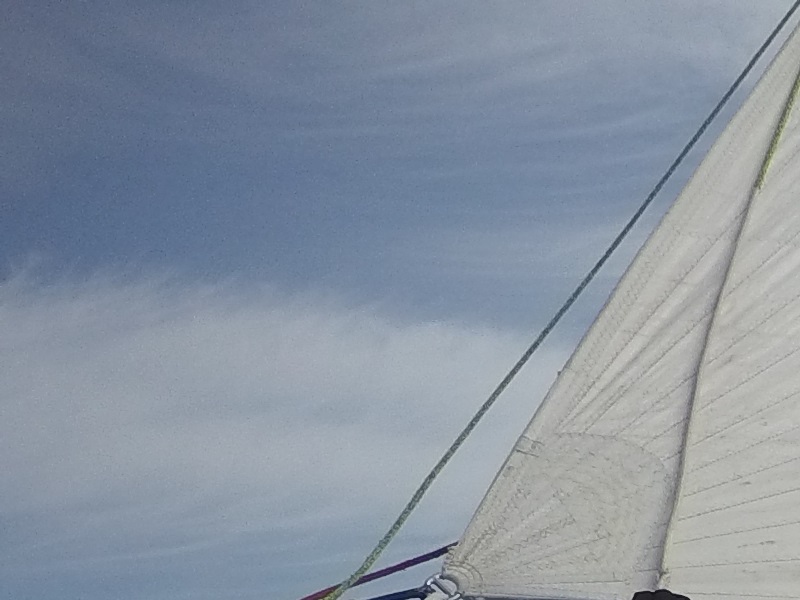 Nachdem unser Smutje gestern das Kochen nach zu großer Schaukelei auf-, sowie abgab, beglückte uns Katrin mit (ihrem ersten selbstgekochten) Risotto. Der nordwestliche Wind schlief über Nacht etwas ein und der Volvo Penta Spi kam für ein paar Stunden zum Einsatz, was uns abgesehen vom Bergemanöver der G3,5 eine sehr ruhige Nacht bescherte, die mit verschiedensten Rätseln und Black Stories irgendwann in einen ramontischen Morgen überging. Ölzeug wurde kurzerhand mit Badebekleidung ausgetauscht und der wache Teil der Crew durfte bei 4000m Wassertiefe ein erfrischendes Bad geniessen, welches am Nachmittag wiederholt wurde, damit keine Wache zu kurz kommt und der Badespaß verkürzte uns natürlich auch das Warten auf den Wind, der jetzt gen Abend wieder auffrischt. Zwischendurch wurde das Cockpit geschrubbt, die Crew ordentlich gebräunt, das Snackschap für die Nacht aufgefüllt und ein Kartoffelsalat nach Omas Rezept zubereitet, auf den wir uns schon alle freuen.