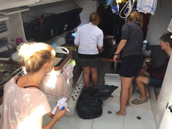 Nach der letzten Etappe sind wir gestern nach einem genialen Chili con Carne früh in die Kojen gefallen und heute ausgeschlafen und voller Vorfreude aus den Kojen gekrabbelt. Einige von uns waren noch am Strand schwimmen, andere bereiteten ein umfangreiches Frühstück vor. Nun wird noch Wasser gebunkert, der Außenborder und Lebensmittel (um)gestaut, Diesel umgetankt, das aktuellste Wetter gezogen und die Taschen umgepackt, damit wir gleich los können.