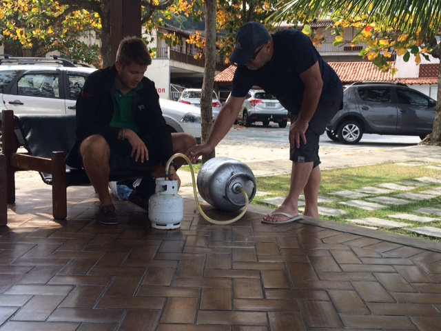 Während die Vorbereitungen für den großen Törn auf Hochtouren laufen, müssen wir mal wieder feststellen, dass doch mehr zu tun ist als gedacht. Wobei wir nun endlich den Punkt erreicht haben, an dem die Liste übersichtlicher wird. Sind ja auch nur noch weniger als 36 Stunden bis zum Start… Um nur einige Aufgaben zu nennen, wurden Batterien geprüft, Bilge und Wassermacher gereinigt, tonnenweise Essen gekauft (in etwa so viel wie ein Mensch innerhalb eines Jahres konsumiert), Wasser gebunkert, Gasflaschen auf die brasilianische Art nachgefüllt, Tourengarderobe ausgestaut etc. pp. Schließlich wurde gerade auch noch die Sicherheitsabnahme durch den Wettfahrtleiter und Steuermannsbesprechung durchgeführt.