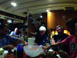 Nach dem Schmaus kamen dann zur Überraschung der Hamburger Gäste Liederbücher auf den Tisch. Eine Tradition des ASV, mit allen Gästen an Bord ein paar flotte Seemanns- und sonstige Lieder zu singen. Zunächst bestaunten die Gäste die Bücher: vom ASV im Selbstverlag mit über 150 Liedern aufgelegt, im handlichen Format in Plastik gebunden. Sehr schick! Dann aber wurden schnell ein paar passende Songs ausgesucht, die dann von erstaunlich sangesfreudigen Seglern mit viel Enthusiasmus vorgetragen wurden. Neben den maritimen Klassikern waren im Fundus aus solche „Schmankerln“ wie „Das Lied von den Lippischen Schützen“ zu finden, und die Bucht von Niteroi kam zu später Stunde in den Genuß des Vortrags dieser Perle des deutschen Liedgutes. Ich wette, das war eine Premiere für diese Region, und glaube, das es nicht wieder so schnell zu erneutem Gehör gebracht werden wird.