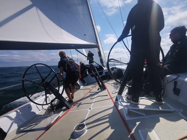 Am nächsten Morgen stand uns der Wind mit stetigen 20Knoten im Rücken, sodass wir den Rückweg schnell unter Gennaker zurücklegen konnten. Auf dieser Tour wurde ordentlich am Grinder gekurbelt, den wir alle noch nicht kannten und der weit anstrengender zu bedienen ist, als er aussieht. Obwohl die ‘Störtebeker’ 47 Fuß lang ist, fährt sie sich durch das Carbon sehr ähnlich zu einer Jolle und ist durch das verminderte Gewicht auch sehr schnell. Wir sind mit flotten 16 Knoten Bootsspeed unterwegs gewesen und hatten alle sehr großen Spaß alle Aufgaben auf dem Boot mal auszuprobieren. Auch das Logbuch haben wir fleißig geführt.