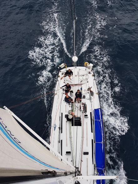 Je näher wir den britischen Hoheitsgewässern kommen, desto weniger Grau kommt der Atlantik daher. Zeit für einen Check des Riggs und laufenden Guts, also ab in den Mast. Der entsandte Emporkömmling genießt auch gleich einige Minuten die seltene Ruhe im dritten OG unserer Offshore Entity und die sich ihm bietende Weitsicht. Endlich ganz oben angekommen, denkt er, bevor die Kollegen vom Arbeitsdeck seine Fallen auch schon wieder abfieren und unseren Klettermax somit wenig subtil wieder auf den Boden der Tatsachen zurückholen. Der Riggcheck ergibt keine Auffälligkeiten, bis auf vielleicht die von oben auffällig grazil und sportlich anmutenden Linien des Schiffsrumpfes und seiner Besatzung, und so segeln wir weiter unter Spi und steigendem Speed gen Lizard Point, unserem nächsten Wegepunkt. Ein paar Wale (Grindwale, laut unseren wandelnden Handbüchern der Sielmannschaft), jagen hinter uns her, und wir hoffen, dass sie nicht zum Kuscheln mit Bruder BroVi kommen. In unseren lässigen Salopetten signalisieren wir jedoch cool und bestimmt, dass wir nicht zu haben sind, so dass die beiden säugenden Freunde trotz der sportlichen Anmut, die sich ihnen bietet, schnell das Interesse verlieren. Man sieht, auch Wale haben ihren Stolz.