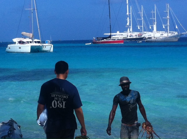 Nach einem Stopp zum Einklarieren auf Canouan (dafür füllt man Formulare in vierfacher Ausfertigung mit Kohlepapier aus) haben wir dann zu dem karibischen Traum verholt. Man ankert direkt hinter dem Riff, an dem sich die Atlantikdünung bricht, der Passat weht stetig, der Himmel ist blau mit den typischen Wolken und das Wasser leuchtet türkisfarben. Die rote Haspa Hamburg bietet aus jeder Perspektive ein Postkartenmotiv und macht eine extrem gute Figur zwischen schicken Mega-Yachten und behäbigen Cruising-Katamaranen.