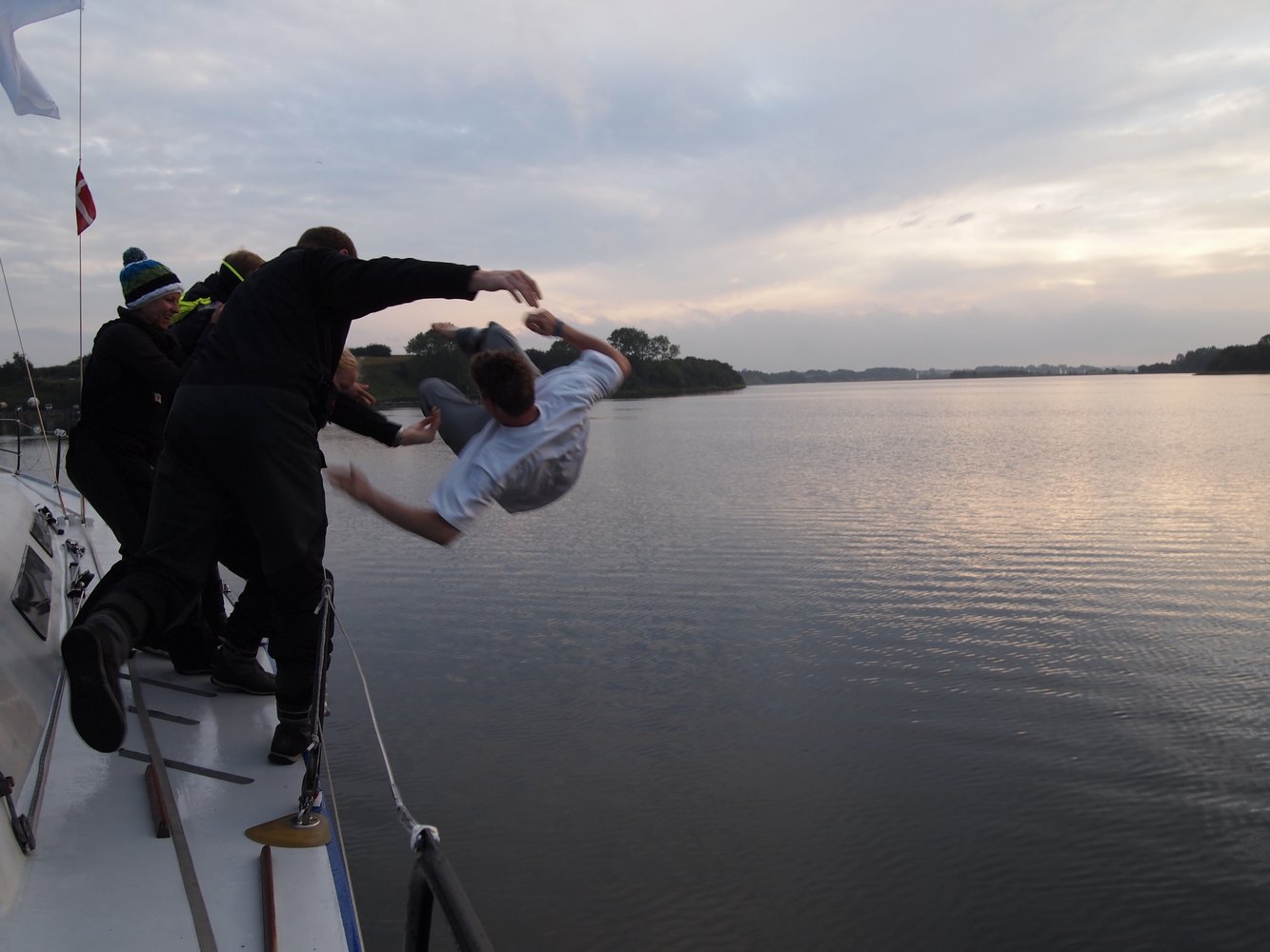Nach einem sehr lustigen Abend in Assens ging es am Mittwoch nach ausgiebigem Frühstück weiter in Richtung Dyvig. Trotz des immer wiederkehrenden leichten Nieselregens war die Stimmung an Bord super und nachdem wir die Lady fest an Land vertäut hatten lichteten sich die Wolken sogar und bescherten und einen wunderschön Sonnenuntergang. Sehr zur Freude unseres Skippers fiel dann JEMANDEM auf, dass die obligatorische „Skippertaufe“ noch aussteht, und da die Dyvig Feuerquallenfrei und es gerade trocken war ist die Gunst der Stunde genutzt worden und Johan hat ein Bad genommen (und eine warme Dusche) .