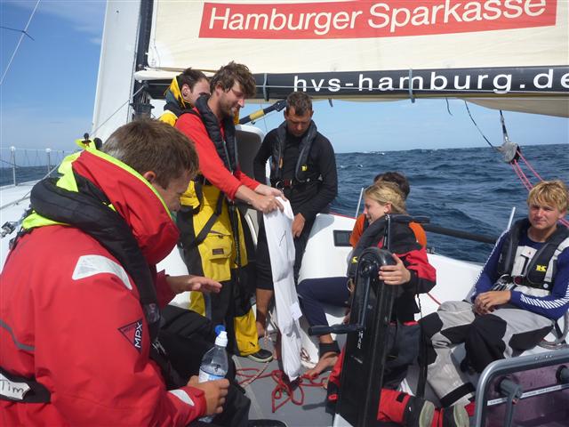 Der eine oder andere Segelwechsel hielt uns nachts auf Trab, die G4 musste am Achterliek repariert werden und dann noch die klatschnasse Jibtop unter Deck wieder gepackt.