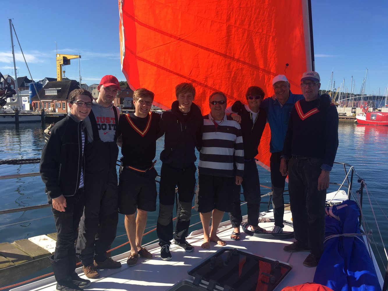 Nun ja, nie waren alle gleichzeitig an Bord. Das lag sowohl am lang geplanten Mallorca Urlaub, aber vor allem an diversen Abi-Entlassungen oder Abibällen und sorgte so für Crewverhältnisse, die eher einem Schweizer Käses glichen. Aber der Skipper kompensierte das durch intensive Tagestrainings vom festen Liegeplatz in Laboe aus und so konnte jeder trotz nächtlichem Abiball, am nächsten Morgen wieder an Bord sein. Was allerdings nie fehlte war die gute Laune. Spätestens nach diesem Wochenende freut sich jeder auf den Maxi-Törn, der Ende November auf uns wartet.