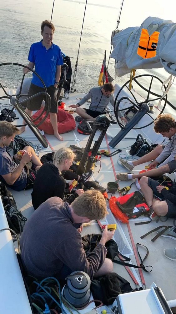Dazu kam eine kleine Badeaktion von Torben, der im Hafenbecken noch kurz nach einer Segellatte tauchen durfte, dessen Schwimmfähigkeit ein Crewmitglied zuvor testen wollte. Um 18:30 ging es dann raus aus der Kieler Förde und los Richtung Stockholm. Begleitet wurden wir dabei von vielen Schweinswalen und von achterlichen flauen Winden die zwischen 0-8 Knoten schwankten und dadurch in der 1. Nacht einige Male der Motor laufen musste. Größte Sorge dabei, nicht genug Schokolade eingekauft zu haben. Am Morgen wurde die Störtebeker von einer Mückenplage mitten auf See heimgesucht; Schiff und Crew wurden von 1000den Mücken belagert, die mühsam mit dem Schrubber entfernt werden mussten. Insgesamt wurde natürlich die Zeit positiv genutzt um das Boot weiter aufs Rennen vorbereitet. So hoffen wir, die restliche Strecke bis Stockholm schnell zurücklegen zu können und freuen uns auf die Regatta! Eure Störtebeker Crew