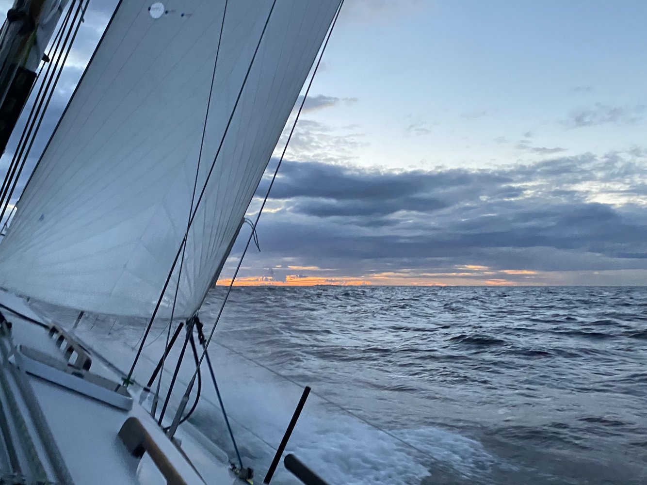 Der Tag startet mit einem wohlverdienten Ausschlafen. Wir liefen dann Punkt 11 Uhr ohne Frühstück aus, welches aber sobald das Groß und die Pam (G2) oben waren und wir mit 10 Knoten dahin rauschten, nachgeholt wurde. Eigentliches Ziel war Helsingeborg, welches mit 20 sm uns dann aber doch viel zu nah war. Die Häfen auf der dänischen Seite des Öresunds waren leider durch Corona auch keine Option. Schnell trafen wir also die Entscheidung, unser nächstes großes Ziel Aarhus anzusteuern. ETA 3 Uhr morgens. Das Wachsystem wurde auch gleich wieder eingeläutet und somit begab sich die erste Freiwache für ein angenehmes Mittagsschläfchen in die Koje. Als wir um ca. 17 Uhr wieder aus den Kojen krochen hatten wir den Öresund schon verlassen und wir liefen volle Höhe. Dies erschwerte durch Schräglage und Welle die Kochsituation, die jedoch als ein leckeres Pilzrisotto auf dem Tellern war schnell wieder vergessen war. Spanned wurde der Abend als wir plötzlich vom dänischen Militär angefunkt wurden da wir eins der zahlreichen Schießgebiete passierten und in dieser Nacht dort tatsächlich eine Übung stattfand. Wir wurden dann aufgefordert, das Gebiet auf direktem Weg Richtung Norden zu verlassen und somit verloren wir viel unserer hart erkämpften Höhe. Als nächstes Highlight überraschte uns eine Welle, die eine Badewannenfüllung durchs offene Luke in die Navi goss. Nicht nur das Logbuch und die Papierkarte waren betroffen auch aus der Tastatur floss das Wasser. Trotz erschwerten Navigationsbedingungen erreichten wir letztendlich zwei Stunden später als geplant Aarhus und ließen uns in die Koje fallen.