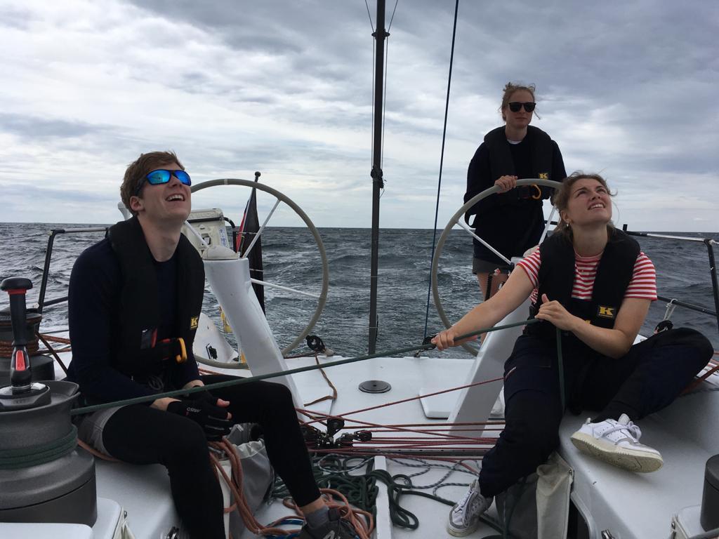 Allerdings erst nach einigen Basteleien, schließlich waren wir die erste Crew dieser Saison und bekanntermaßen wird im Winterlager nie alles fertig. Mit einer warmen Brise ging es schließlich endlich Richtung Schlei und in Rickis Geburtstag hinein, der pünktlich um 00:00 an der Ansteuerungstonne besungen wurde.Sein neues Lebensjahr haben wir in Maasholm, mit einem Gin-Basil-Smash und gleich zwei selbstgebackenen Kuchen, gebührend gefeiert. Am nächsten Tag ging es mit den Spi S4 und guten Druck von Hinten nach Heiligenhafen, wo der Grill schon auf uns wartete. Am Abend haben wir ein lustiges Spiel gespielt, bei den u. a. unsere Skipperin Katrina probiert hat Rost Pantomimisch darzustellen. Dies war jedoch nicht von Erfolg gekrönt und hat nur zu schwitzigen Füßen geführt. Sonntag ging es dann leider wieder zurück nach Düsternbrook. Der Badestopp und der eingefangen Sonnenbrand auf den Weg haben unsere tolle Wochenendtour abgerundet. Haltet die Füße feucht. Katrina, Lina, Josi, Bende, Ricki