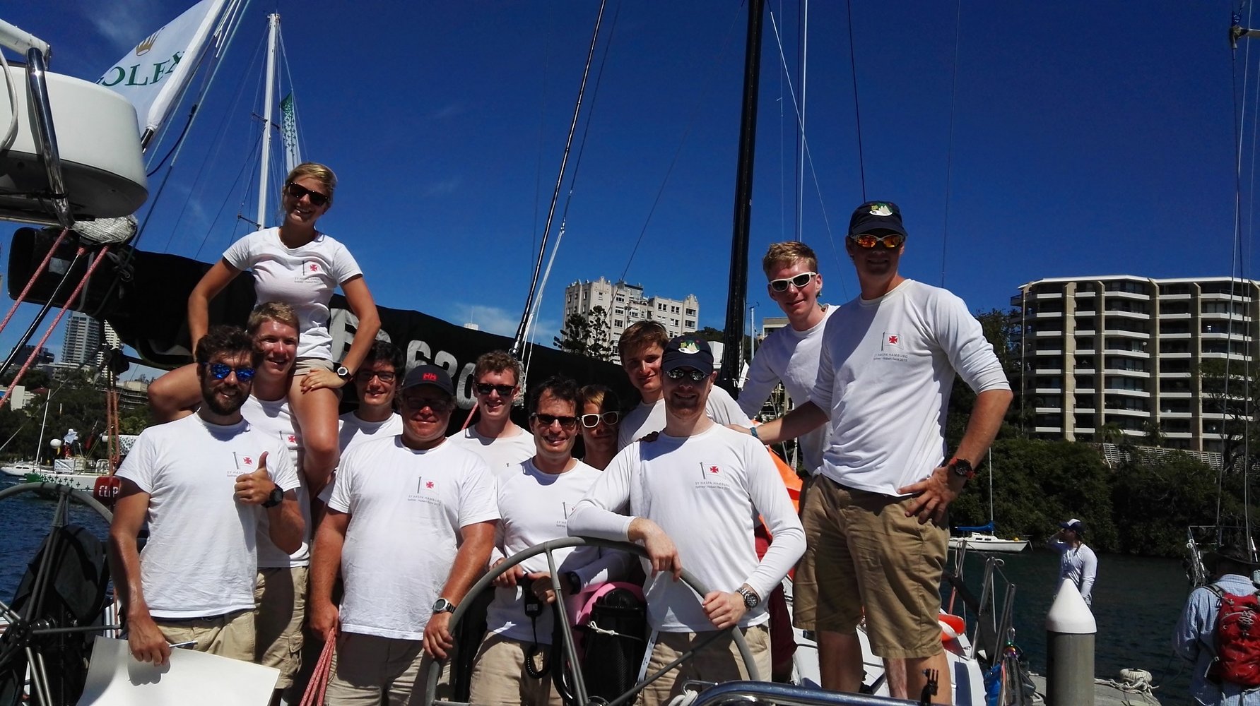 Drei Stunden vor dem Start legten wir ab, um uns bei einem der Startschiffe einzuchecken. Alle Crewmitglieder in Schwimmwesten aufgereiht, die roten Segel gesetzt, mussten wir dicht genug vorbeifahren, um "12 people on board" zurufen zu können. Bei aktuell 20-25 Knoten Wind im Port Jackson gar nicht so einfach.