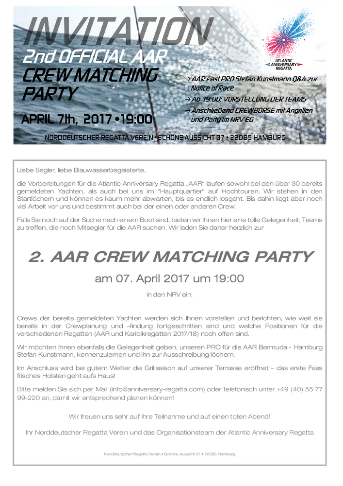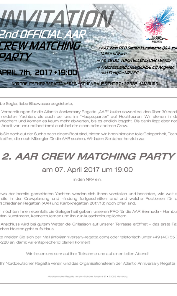 Am Freitag den 07. April wird im NRV eine crew matching party anlässlich der NRV Jubiläumsregatta (Atlantic Anniversary Regatta: Teneriffa – Virgin Gorda und Bermuda – Hamburg) stattfinden. Die Veranstaltung soll allen interessierten Seglern die Möglichkeit bieten, sich auszutauschen und die Crewfindung zu erleichtern.