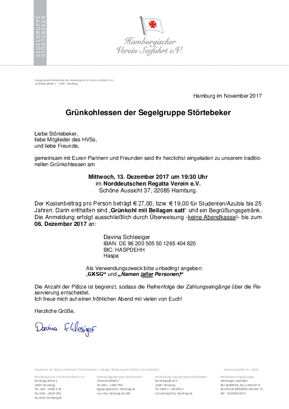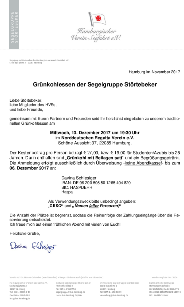 Das alljährliche Grünkohlessen der Segelgruppe findet am 13.12. im NRV statt