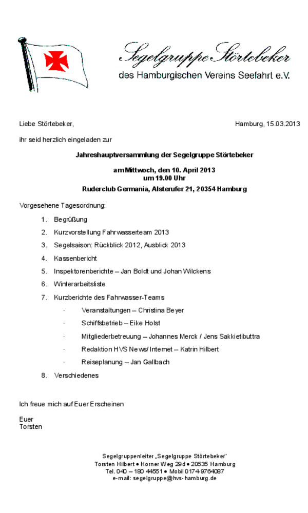 Am 10. April um 19.00 Uhr findet die Jahreshauptversammlung der Segelgruppeim