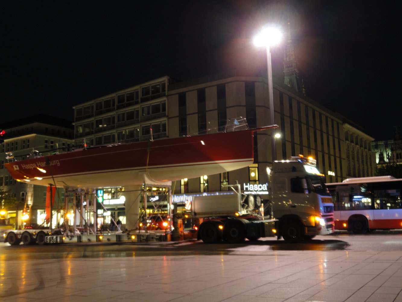 Vergangene Woche wurde die Haspa Hamburg auf einem Tieflader vom Kreuzfahrtterminal zum Messegelände gebracht.